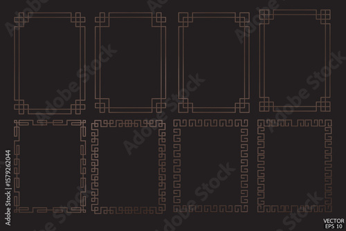 Simple wood geometric frames are isolated on black background. Luxury dark brown wood borders for invitations, luxury templates, and decorative patterns. Chinese border design.