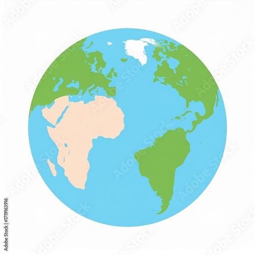 Simplified world map illustration, continents, green landmasses, blue oceans, earth globe.