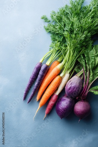 simplistic composition featuring assortment of colorful non-gmo vegetables laid out on flat monochrome backdrop