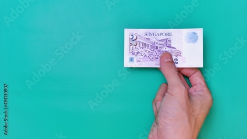 Singapore Dollar is the official currency of Singapore. Business Investment Economy Money Income Loan and Finance concept. Businessman's hand showing Singapore Dollar on a green background. 2 SGD.