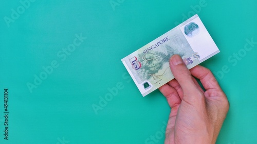 Singapore Dollar is the official currency of Singapore. Business Investment Economy Money Income Loan and Finance concept. Businessman's hand showing Singapore Dollar on a green background. 5 Five SGD