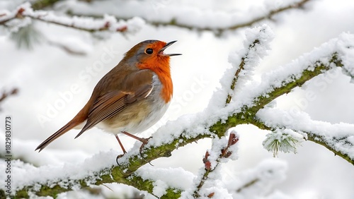 Singing robin perched on snowy branch cut out isolated on white with shadow. AI generated.