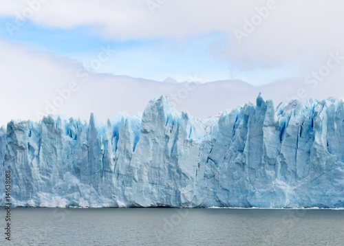 Single big blue iceberg in blue water in the center of the picture and blue sky with clouds on the background. Patagonia, Argentina