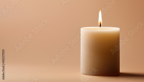 single burning candle on beige background
