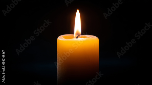 Single burning candle with bright flame on black background creating warm and cozy light atmosphere in dark room.
