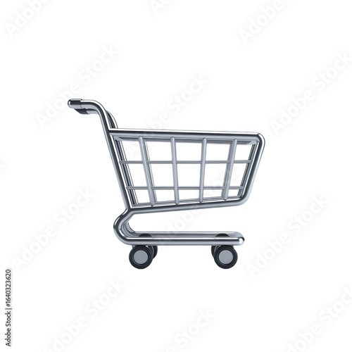 Single Chrome Shopping Cart or Trolley with Wheels and Handle, Isolated on a Transparent Background for Retail and Online Shopping Concepts