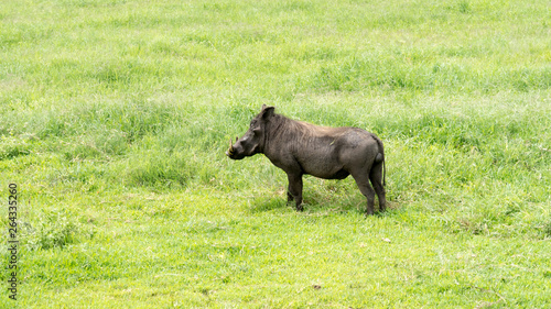 Single common warthog (Phacochoerus africanus) on the grassy plains of Tanzania.