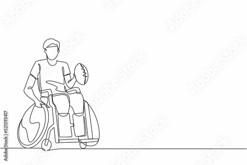 Single continuous line drawing American football player recovering from injury on wheelchair. man playing on sport competition. Athlete with physical disorder. One line graphic design vector