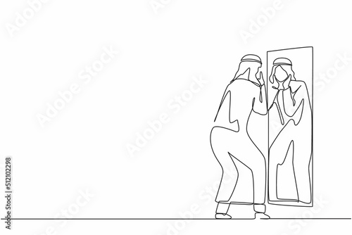 Single continuous line drawing Arab businessman holding his face on reflection mirror. Man applying lotion on stubble after-shaving or trimming, looking at mirror. One line draw graphic design vector