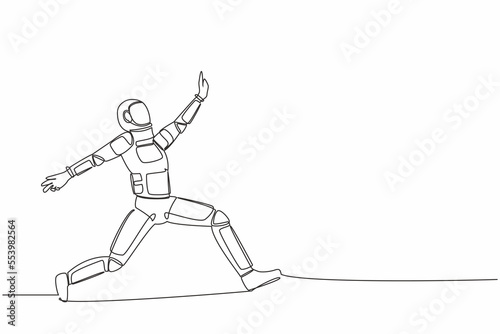 Single continuous line drawing happy astronaut jumping with spread both leg and raise one hand. Celebrating successful spaceship mission. Cosmonaut deep space. One line draw design vector illustration