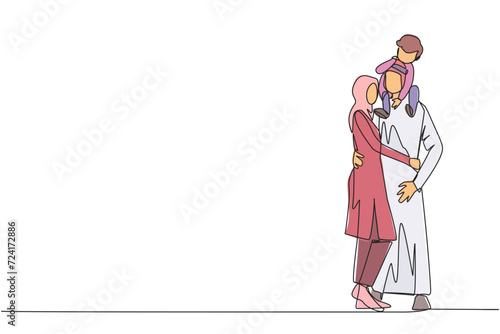 Single continuous line drawing of young Arabian woman hug her handsome husband who is holding their little cute son on shoulders hug. Happy Arabian family concept. One line design vector illustration