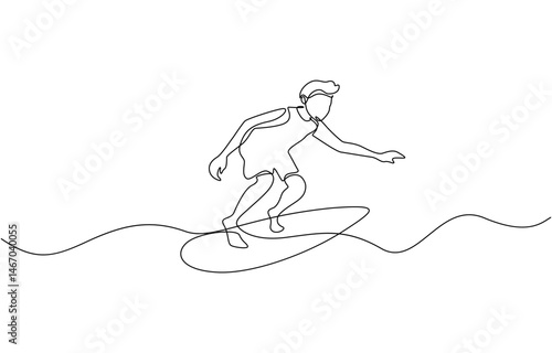 Single continuous line drawing young professional surfer in action riding the waves on blue ocean, Continuous one line drawing of man surfing a big wave. Single line drawing surfer design.