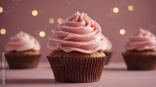 Single cupcakes with pink frosting and sugar rose in front of pink background.