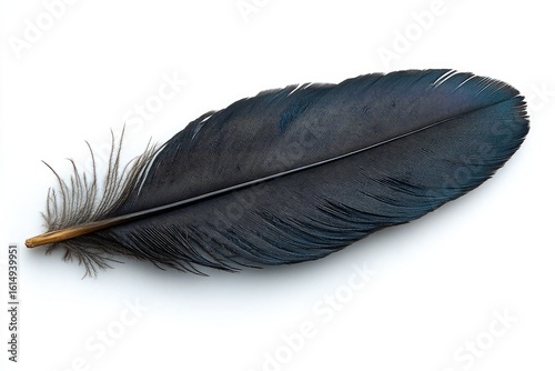 Single dark blue feather isolated on white background, macro shot. Use for design, art, craft, and natural or avian related projects.