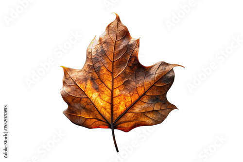 Single dry brown and orange autumn leaf with detailed veins on black background isolated on a transparent background