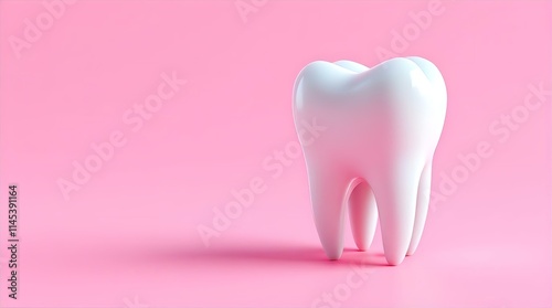 Single, glossy white tooth model on a pink background, 3D rendering, clean, healthy, dental care concept, minimalist style.