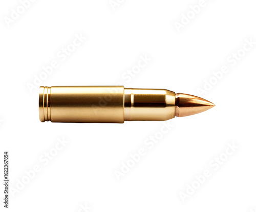 Single golden bullet ammunition, a symbol of power and danger, isolated on transparent background