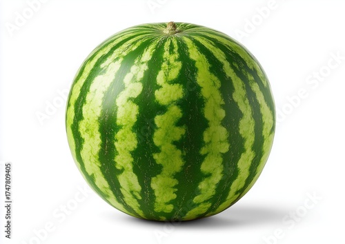 Single green striped watermelon isolated on white background clean minimal composition highlighting freshness concept