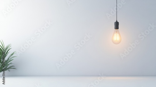 single incandescent bulb suspended from stark white ceiling casting gentle pool of light onto pristine white table