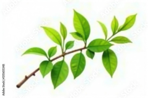Single isolated branch with green leaves on white background, nature, twig, isolation