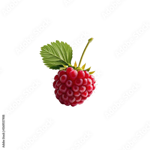 Single Juicy Raspberry with Green Leaf on Transparent Background