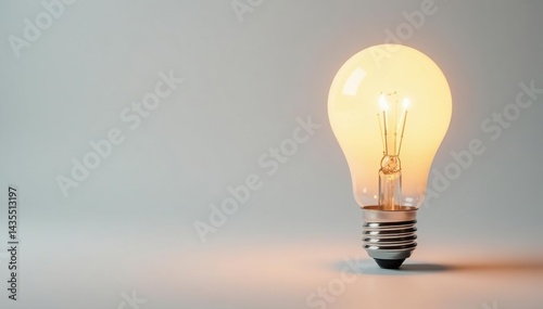 Single lightbulb, glowing brightly on pure white background, filament, invention, glass