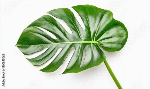 Single Monstera leaf on white background, tropical plant, nature photography, design element