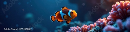 Single ocellaris clownfish swimming in dark blue water, coral shadow , underwater, coral
