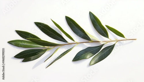 Single olive branch with elongated dark green leaves casting soft shadows on white background symbolizing simplicity and natural beauty