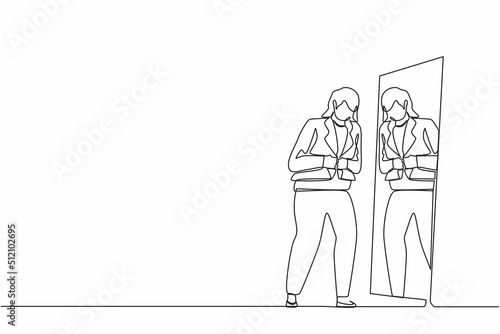 Single one line drawing beautiful businesswoman looking at mirror, look at herself, adjusting her shirt button of formal wear blazer, prepare herself for working. Continuous line draw design vector