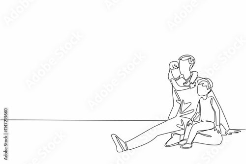 Single one line drawing father sit on the floor holding son. Girls hug from behind. Relieve fatigue by playing with children. National Single Parent Day. Continuous line design graphic illustration