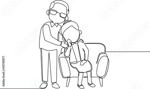 sitting on the sofa and grandpa giving support to grandma with love. Grandparents day. Continuous line draw design graphic vector illustration.
