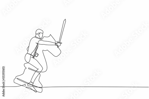 Single one line drawing of brave businessman riding big horse chess piece with sword. Business strategy, winning competition, achievement goal concept. Continuous line draw design vector illustration