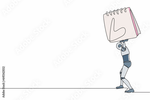 Single one line drawing tired robot carrying heavy calendar on his back. Cyborg with work problem and deadline. Humanoid robot cybernetic organism. Continuous line graphic design vector illustration
