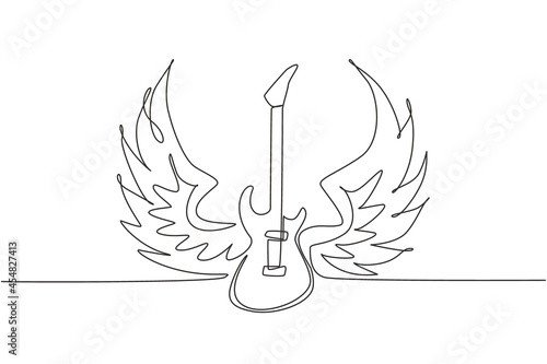 Single one line drawing vintage vector label with rock and roll forever and guitar (T-Shirt Print). Music design. Hand drawn trace image. Hipster rock festival poster. Continuous line draw design