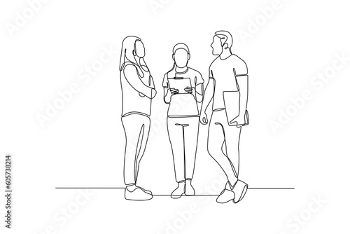 Single one-line drawing three students discussing. Diversity in college concept. Continuous line drawing illustration
