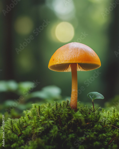 Single orange mushroom growing on lush green moss in a sunlit forest
