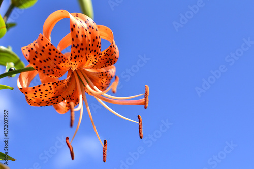 Single orange tiger lily in bloom, vibrant mood, against a clear blue sky for vibrant nature photography and floral aesthetics
