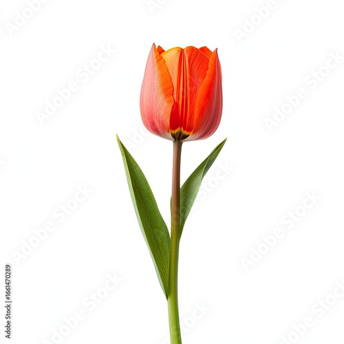 Single orange-red tulip on white background