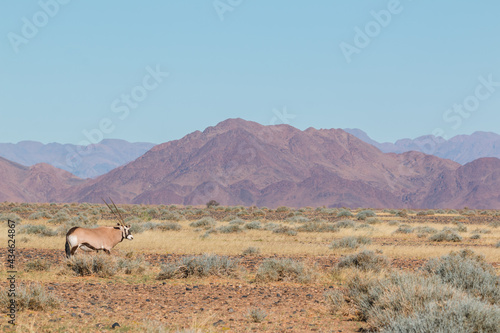 single oryx antelope in typical sossusvlei landscape during 2021 self drive in beautiful light setting