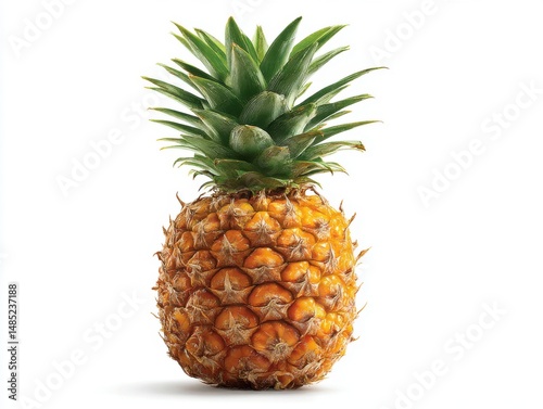Single pineapple fruit standing upright on white background studio shot tropical exotic healthy eating