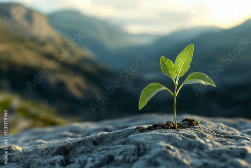 Single Plant Sprouting on Textured Surface with Mountain Background