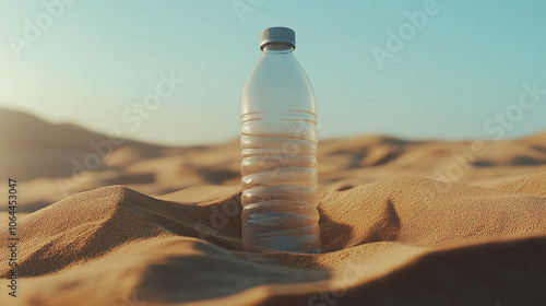 Single plastic bottle partially buried in sand, highlighting pollution in natural settings with a clean and modern aesthetic