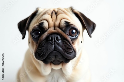 Single pug looking at camera, pure white backdrop, white, fawn, single
