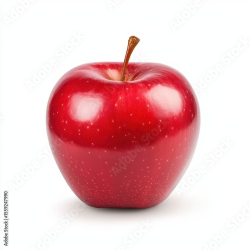 Single red apple with stem isolated on white background, high-resolution image showing realistic texture and vibrant color.