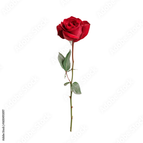 single red rose with green leaves, symbolizing love and beauty, stands elegantly against transparent background. This classic flower is perfect for romantic occasions