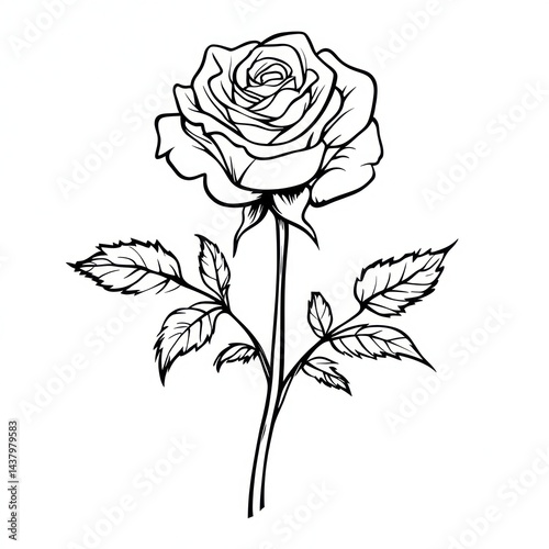 Single rose line drawing, white background, botanical illustration, for greeting cards