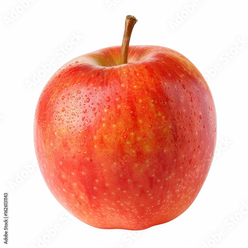 Single, round, red apple with subtle yellow stripes, wet, isolated