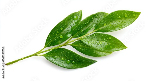 Single Ruscus leaf with dewdrops shown isolated against a white background