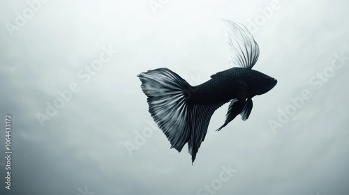 Single Siamese fighting fish with black and white fins, minimalist underwater setting